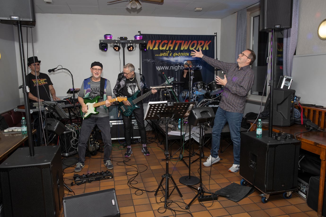 Dann sorgt die Düsseldorfer Band NIGHTWORK für echte Livemusik-Stimmung, mitknackigem Schlagzeug, erdigem Bass, satten Keyboards, fetter Gitarre und markantem Gesang.