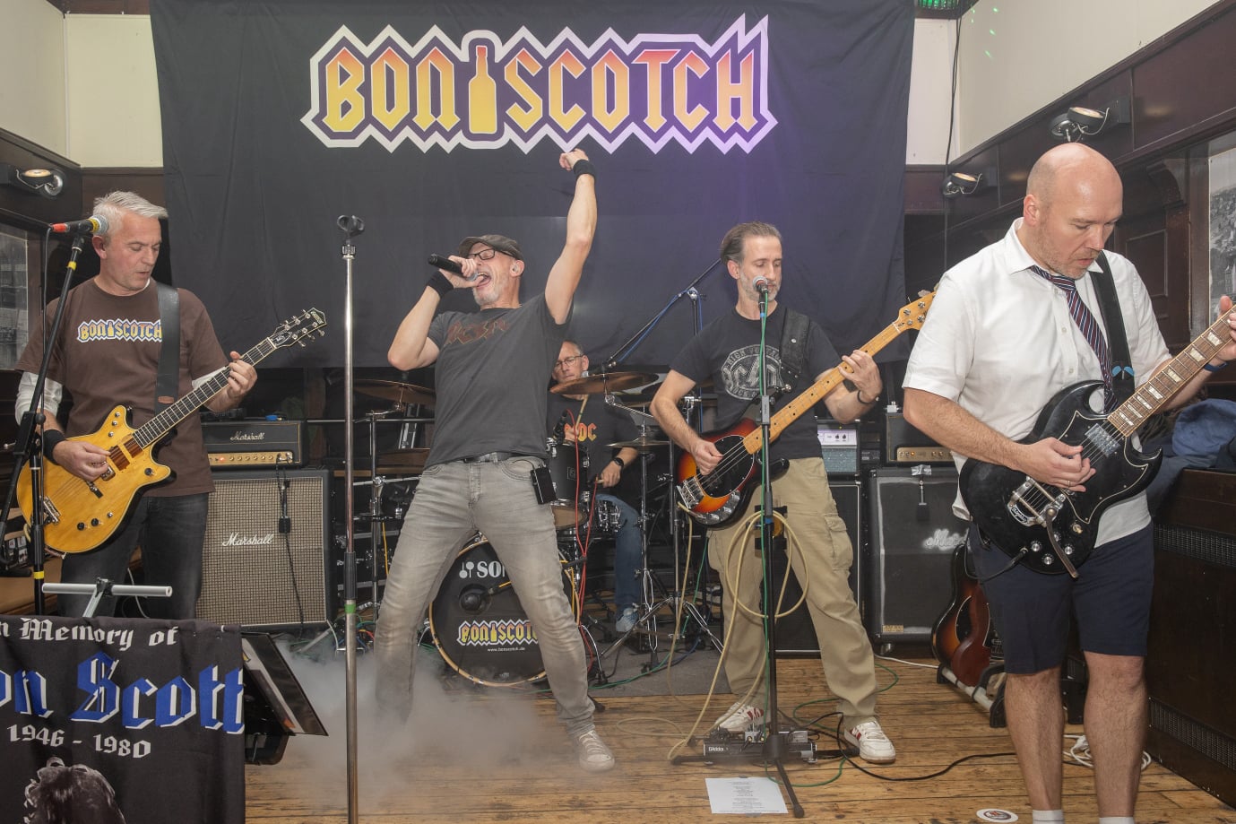 Sir schreiben das Jahr 1973 – Die Watergate-Affäre erschüttert das Weiße Haus, Borussia Mönchengladbach wird zum 2. Mal Pokalsieger und die Brüder Angus und Malcom Young gründen die Band AC/DC...37 Jahre, unzählige Hits und über 200 Millionen verkaufte Tonträger später finden sich 5 Starkstrom-Junkies Ende 2010 zusammen und gründen die Band BonScotch, um ihren Idolen zu huldigen.