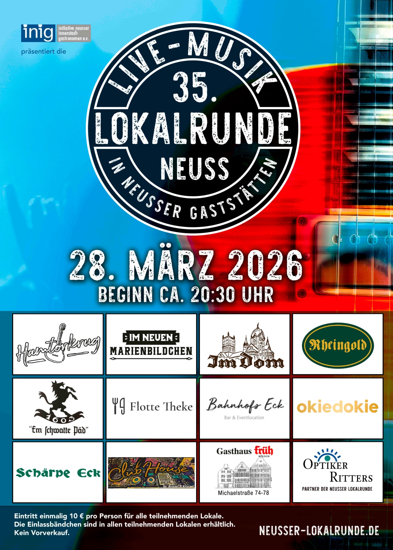 Am Samstag, dem 28. März 2026, wird die nächste Neusser Lokalrunde veranstaltet. 11 Lokale, 11 Bands und eine Vielzahl von Hits aus diversen Genres – das ist das Versprechen der 35. Neusser Lokalrunde. Das Event startet gegen 20:30 Uhr.