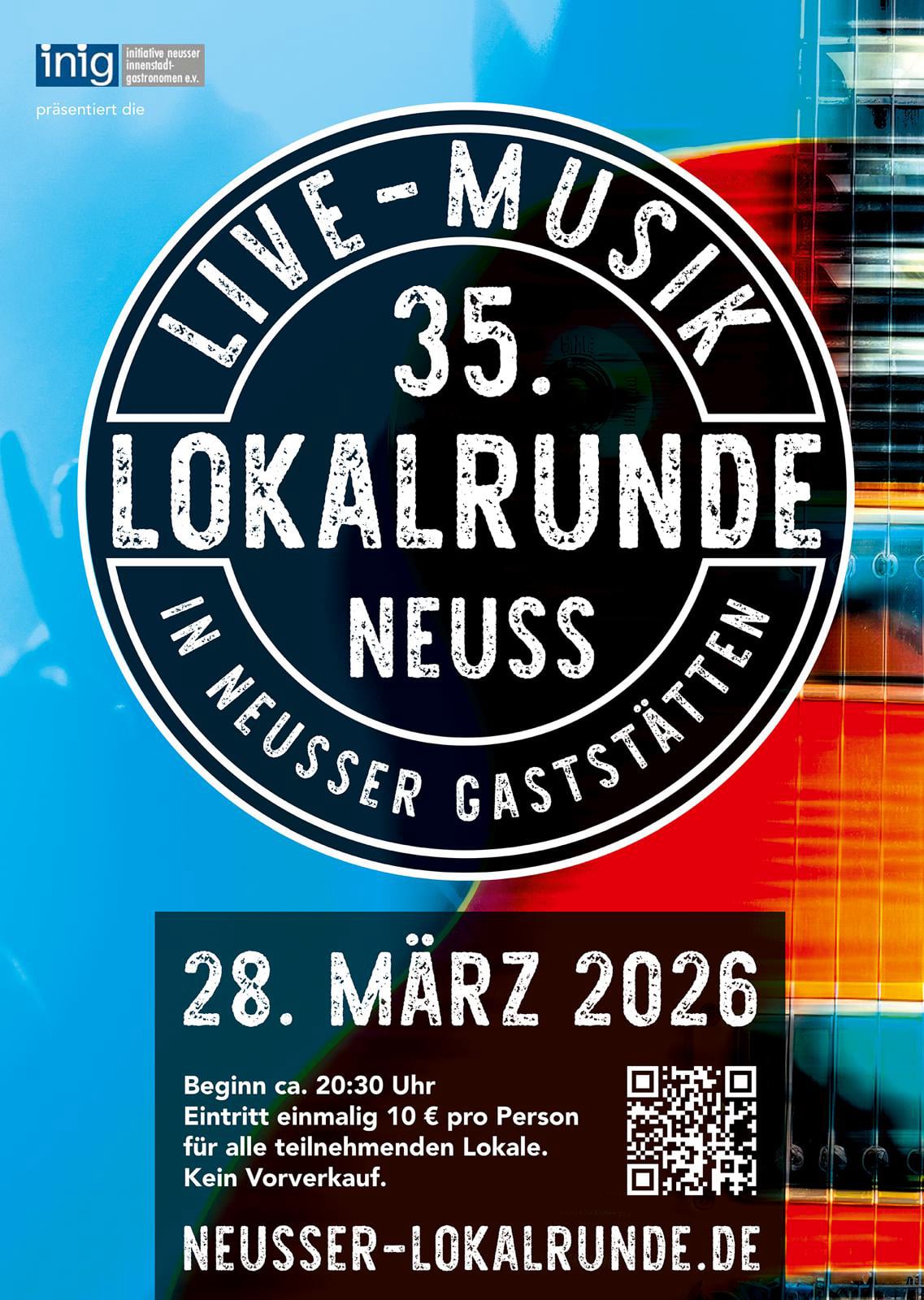 Am Samstag, dem 28. März 2026, wird die nächste Neusser Lokalrunde veranstaltet. X Lokale, X Bands und eine Vielzahl von Hits aus diversen Genres – das ist das Versprechen der 35. Neusser Lokalrunde. Das Event startet gegen 20:30 Uhr.